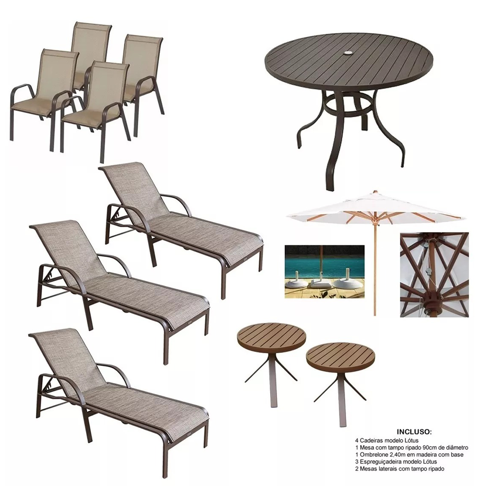 Transforme sua área de piscina em um paraíso com nosso kit completo de mobiliário, incluindo espreguiçadeiras, mesa com cadeiras, mesinha lateral e ombrelone. Design elegante e materiais duráveis para anos de conforto. Adquira agora e desfrute de sua área de piscina ao máximo!